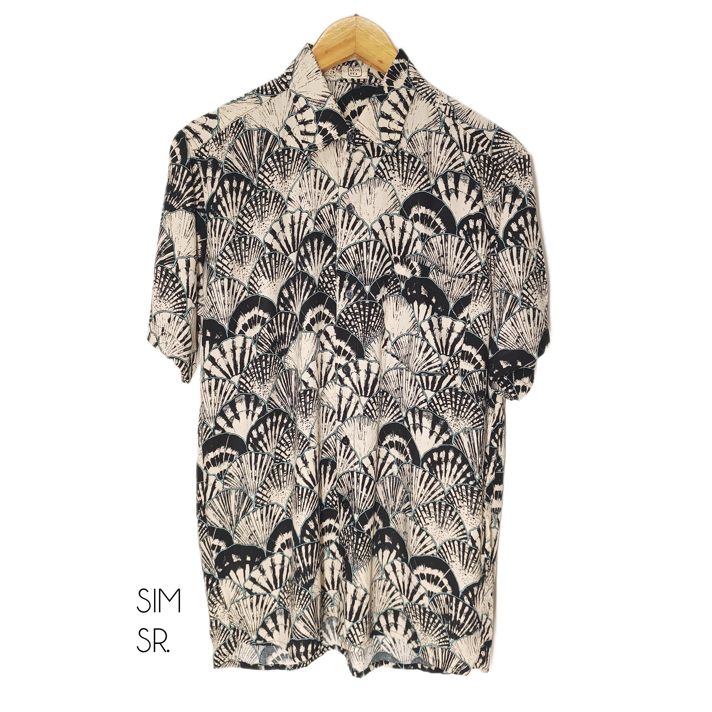 Camisa ampla em viscose leve com estampa de conchas. Caimento solto, bolso frontal e frescor para o seu dia a dia.